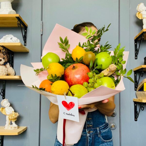 яблоки киви лимоны виноград гранат имбирь зелень Общий вес ~ 2 кгДиаметр ~25-30смЛюбой подарок можно дополнить напитками, по поручению заказчика.