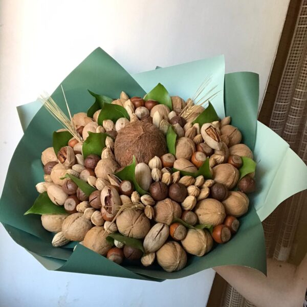 кокос грецкий орех фисташки макадамия фундук пекан миндаль зелень Общий вес ~ 1,5 кгДиаметр ~25-30смЛюбой подарок можно дополнить напитками, по
