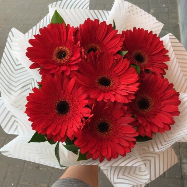 Герберы 7 шт желтые или другого цвета на Ваш выбор с зеленью в стильном оформлении.