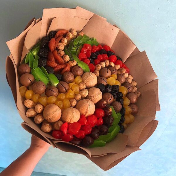 сухофрукты орехи цукаты Вес брутто ~ 1 кг.Диаметр ~25 смЛюбой подарок можно дополнить напитками, по поручению заказчика. Приобретается в розничном