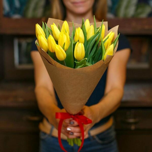 Букет из 15 тюльпанов порадует любую женщину. Цвет букета может быть разным в зависимости от ваших пожеланий.