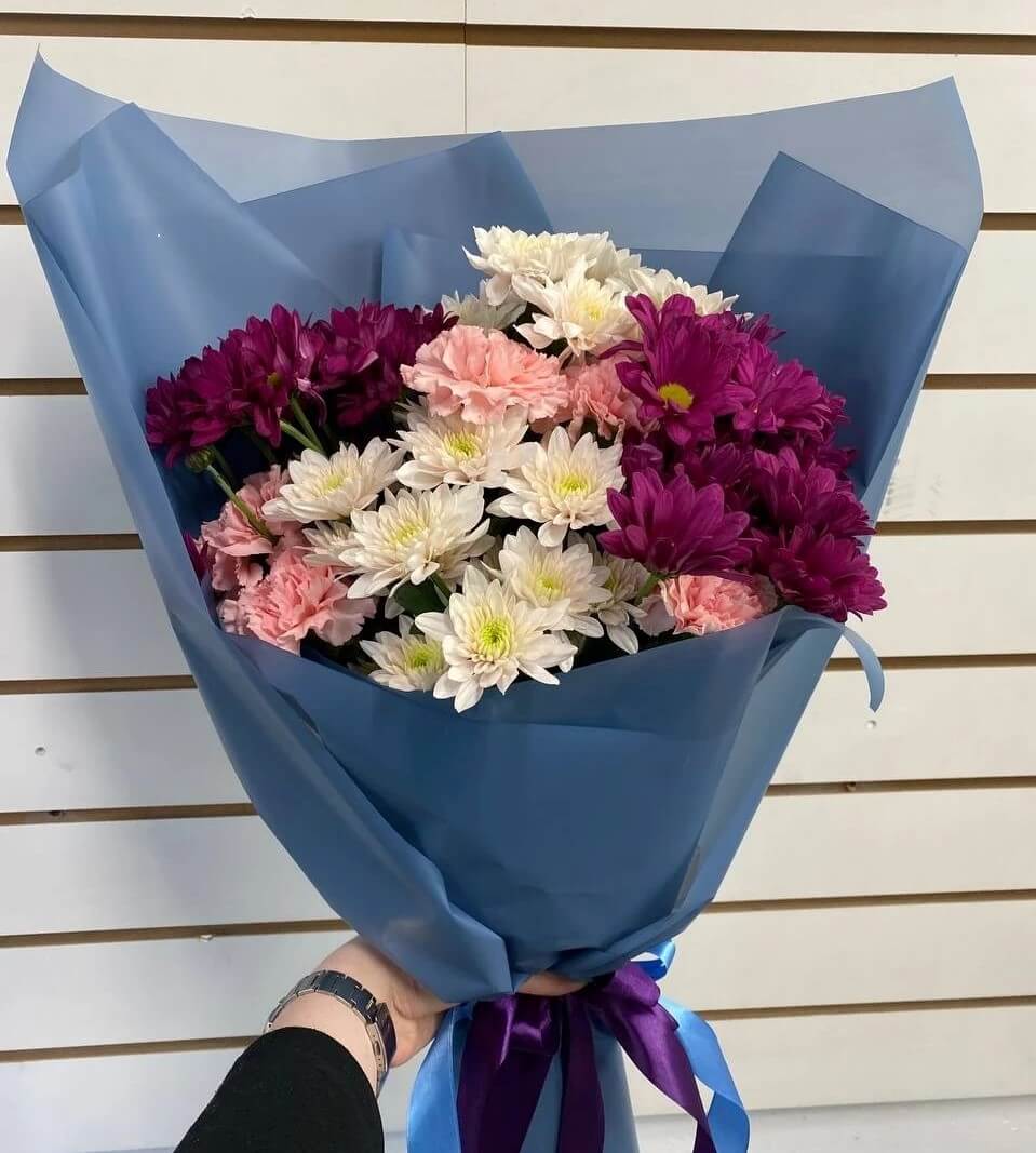 Состав: кустовые хризантемы — 4шт, диантусы — 5шт, оформление.