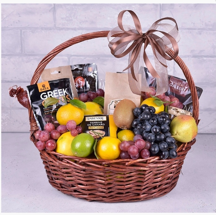 Состав: мясные деликатесы, хамон в нарезке, прошутто, колбаски, сыровяленная колбаса, паштет утиный, вяленые томаты, соус, орехи (кешью, миндаль), фрукты (виноград, киви, лимоны, груши, лайм).