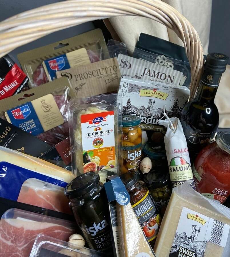 Состав: форель с/с, икра, мясо краба, мясные деликатесы, сыровяленная колбаса, колбаски, сыр (бри, чеддер, пармезан и пр.), хамон нарезка, багеты, паштеты из дичи, нерафинированное оливковое масло, темный шоколад, джем, мед, кофе, оливки, каперсы, орех макадамии, орехи в шоколаде.